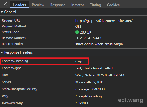 gzipis not present, add the Gzip compression middleware in code, redeploy, and check the response headers again.