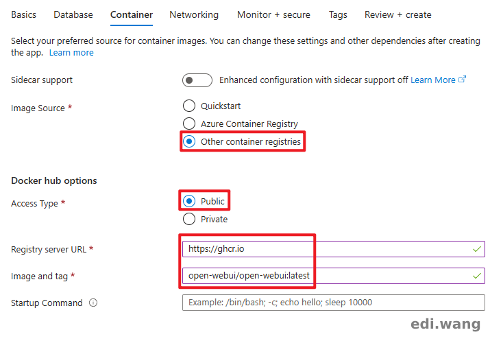 - For Image and tag, use the Open WebUI image you want to deploy: