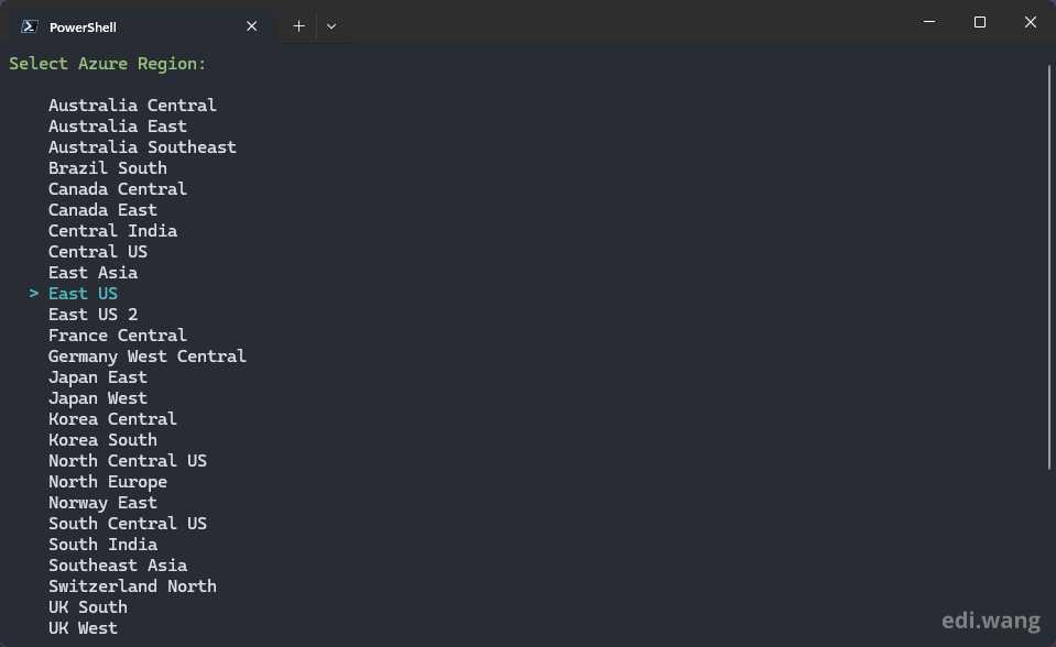 $regionName = Show-Menu -Title "Select Azure Region:" -Options $azureRegions -DefaultIndex $defaultIndex