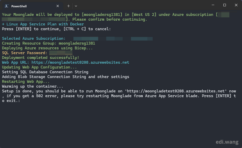For a long time, my Moonglade blog had a single, fairly long PowerShell script that did everything from prompting for subscription and region, to generate random names and passwords, then create App Service Plan, Web App, SQL Server, SQL Database, Storage Account, and finally configure connection strings and app settings.