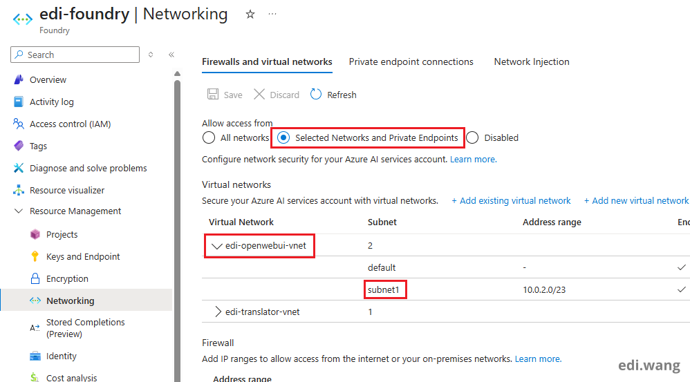 After that, you can configure Azure AI Foundry to allow access only from selected networks, including the vNET used by your Container Apps environment. Make sure the correct subnet is included as well.